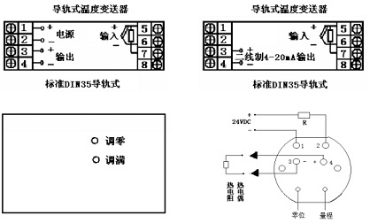 對(duì)導(dǎo)軌式溫度變送器輸入可以是熱電偶、熱電阻、標(biāo)準(zhǔn)信號(hào)。工作電源接端子12,4~20mA輸出信號(hào)接3正、4負(fù);對(duì)二線制4~20mA輸入信號(hào)正接5、負(fù)接6;熱電阻單端A5、并聯(lián)端BC分別接6、7。